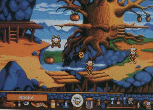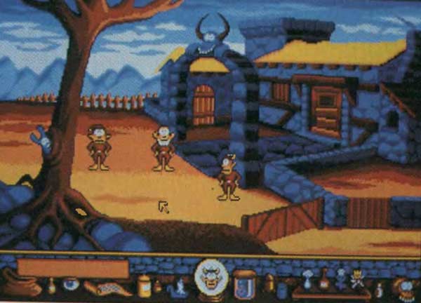 Das Trio schlägt sich durch 20 Screens (per Paßwort direkt zugänglich) einer bonbonfarbenen Schnuckelwelt. Jeder Screen enthält eine Reihe von kniffligen Rätseln, Fallen und Feinden, die erst bewältigt werden müssen, bevor der Weg zum nächsten frei wird. Alle drei Kerlchen tapsen auf dem Schirm herum, aber nur jeweils einer von ihnen läßt sich durch Mausklicks kommandieren. Einzig die richtige Kombination der verschiedenen Goblin-Gaben führt zum Erfolg. Falsche Aktionen geben Energieabzug Im ersten Screen z. B. sucht das Gespann eine Hacke, um nach Diamanten zu buddeln. Also prügelt der Krieger um sich, bis das verdorrte Vieh am Torbogen des Hauses ein Horn verliert. Dort trötet der Techniker hinein, worauf ein Ast vom Baum kracht. Der Zauberer verzaubert das Ganze zur Hacke und die Jungs können weitermarschieren.