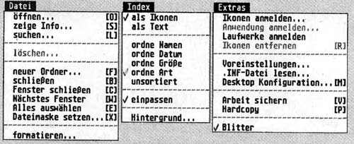 Wenn der Autoordner abgearbeitet wurde, landen Sie, wie gewohnt, auf dem Desktop. Hier hat sich eine Menge getan, was Ihnen schon ein Streifzug durch die Menüs zeigt. Hinter vielen Optionen steht nun ein Buchstabe und signalisiert, daß sie nun alternativ zur Mausbedienung auch per Tastatur aufzurufen sind. Beispielsweise können Sie sich mit einem Tastendruck eine Information über vorher selektierte Dateien geben lassen. Die Tasten für den Aufruf der meisten Funktionen dürfen Sie frei bestimmen. Wenn Sie den Umgang mit sauber programmierten GEM-Programmen gewöhnt sind, werden Sie es sicherlich wie wir eigenartig finden, daß der Desktop nicht die übliche Art der Tastatursteuerung anbietet, die normalerweise auch die Control- und die Alternate-Taste hinzuzieht. Trotzdem ist diese Erweiterung ein großer Vorteil gegenüber dem alten Desktop.
