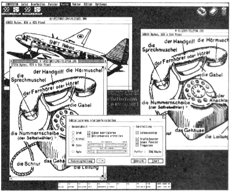 Der Grafikkonverter »Convector Zwei« ist lieferbar. Er wandelt Rastergrafiken in Vektorformate mit Bezier-Polygonen und ermöglicht dadurch die flexible Weiterverarbeitung gescannter Vorlagen. Convector 2 arbeitet auch als Accessory und speichert im GEM/3-, Megapaint-, Calamus- und Postscript-Format. Er kostet 328 Mark, das Update 100 Mark. Ebenfalls ein Update gibt es vom Raster-Vektor-Grafikprogramm »Arabesque Professional«. Das Upgrade kostet 30 Mark. Neue Shift-Adresse! (hu)