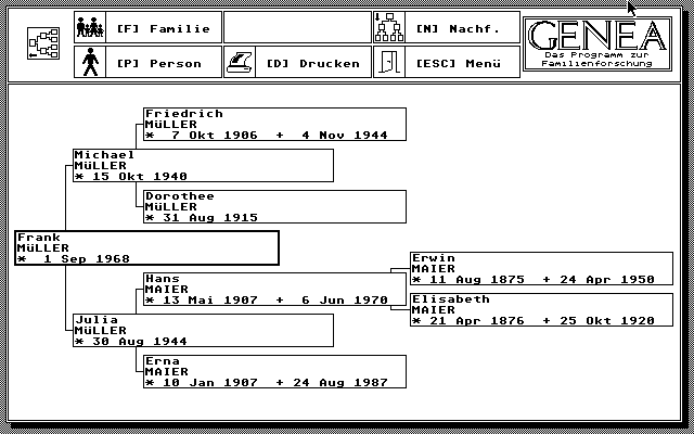 Ein anderes Programm, »Genea«, geht ähnliche Wege. Allerdings verarbeitet es wesentlich komplexere Daten und Zusammenhänge. Für jede Person lassen sich neben den Standardeingaben zusätzlich auch Heiratsdaten integrieren. Außerdem beschränkt sich Genea nicht auf die Eingabe einer Kernfamilie — also Vater, Mutter, ein Kind — auch die Geschwister werden berücksichtigt.