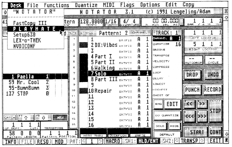 »Playmate« nennt sich ein Accessory, das ausschließlich im Zusammenhang mit dem Creator/Notator-Sequenzer der Fa. C-LAB arbeitet. Erst nach dem Start des Sequenzers läßt sich das Accessory aktivieren! Dem Creator/Notator-User steht so in gewohnter Arbeitsumgebung ein leistungsfähiges Composer-Utility zur Verfügung, mit dem sich in Echtzeit auf neuartige Weise Sequenzen generieren lassen. Sie übertragen die fertigen Sequenzen anschließend direkt auf die Sequenzer-Spur. Ein am MIDI-Input angeschlossenes Keyboard dient zum anwählen, eingeben und abspielen der Tonfolgen. Jede Taste läßt sich mit einer Folge von bis zu 16 Noten belegen. Ein Macro-Menü stellt diverse Funktionen zur Bearbeitung der Tonfolge zur Verfügung. Die Vollversion inkl. Manual ist für 79 Mark (per Postoder Bankscheck, zzgl. 7 Mark bei Nachnahme) direkt beim Autor zu beziehen.