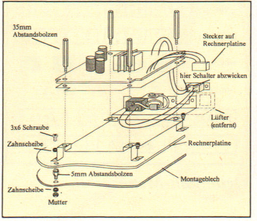 Das Multiboard mißt über zwei Thermosensoren die Temperatur im Innern des Gehäuses. Der Lüfter (natürlich verwendet man den leiseren Festplatten-Fan und nicht den winzigen Mega-ST-Heuler) arbeitet normalerweise mit minimaler Drehzahl. Erst wenn die Innentemperatur steigt, erhöht er seinen Luftdurchsatz, um dann bei 40 Grad Celsius mit voller Leistung zu röhren. Steigt die Temperatur noch weiter an — was eigentlich nicht Vorkommen sollte — leuchtet eine rote Alarm-LED am Frontpanel auf und ein Piepston. warnt vor Überhitzung. Ein kleines Batteriefach für zwei 1,5-V-Zellen nimmt die Stromversorgung für die Uhr auf.