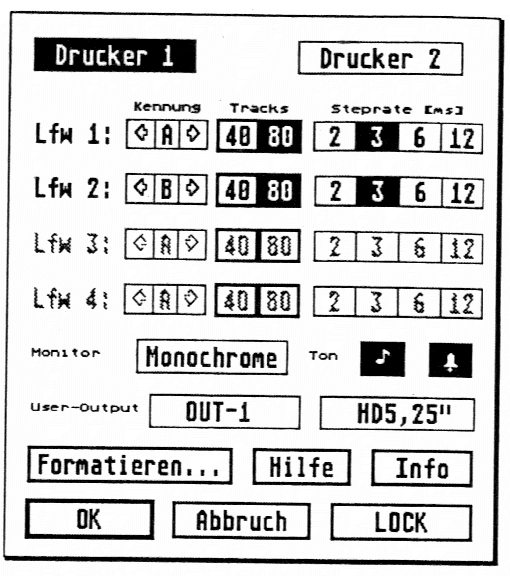 Octobrain findet ein Plätzchen im Auto-Ordner (läßt sich aber auch nachträglich starten), das Octobus-Accessory steuert die Erweiterungskarte. Hier lassen sich Stepraten für 5,25-Zoll-oder HD-Laufwerke einstellen, Disketten formatieren sowie Monochrom und Farbe wechseln (vorausgesetzt zwei Monitore sind vorhanden). Ein besonderer Gag ist die »Lock-Funktion«: Einmal aktiviert, sperrt sie den Computer durch ein achtstelliges Paßwort für jeden weiteren Zugriff und läßt sich auch durch einen Kaltstart nicht ins Bockshorn jagen. Wer hier wieder reinwill, muß die Harddisk schon mit einem Treiber von Disk hochfahren.