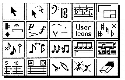Leider kann Masterscore II keine Grafiken einlesen. Allerdings läßt sich diese Schwachstelle elegant umgehen: Masterscore verwaltet nämlich neben Noten-und Textrahmen noch Blank-Rahmen, die sich als Graurasterflächen mit verschiedenen Abstufungen darstellen lassen. Diese Rahmen haben einen variablen Rand. Damit sind auch völlig weiße Flächen möglich — als Platzhalter für Grafiken oder zum Überdecken unerwünschter Notentexte.