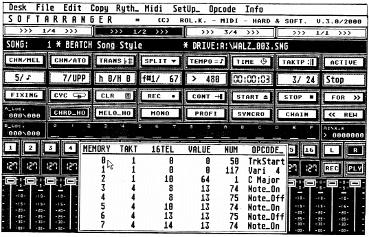 In eine Szenerie wie in der Kommandozentrale eines Raumschiffs, versetzt Sie die Mainpage des »Soft Arrangers« von »Rol. K.-MIDI-Hard & Soft«. Nicht nur der Bildschirm ist übervoll mit Bedien-Elementen — auch die Tastatur ist doppelt und dreifach mit Funktionen zur Kontrolle und Steuerung der unterschiedlichsten musikalischen Elemente belegt. Dadurch ist der Soft Arranger auch ohne Monitor zum Liveeinsatz auf der Bühne geeignet. Über Funktionstasten lassen sich die verschiedensten Variationen, Intros oder Endings, aufrufen. Ein integrierter MIDI-Real-Time-Mixer sorgt dabei für die rechte Balance. Die Variationen beruhen auf vordefinierten »Style«-Files. Eine Reihe zusätzlicher Musikstile liefert der Hersteller als Zubehör. Das Sortiment wird stets erweitert und aktualisiert. Wer will, kann mit etwas Geduld »Style«-Files aber auch selbst erzeugen.