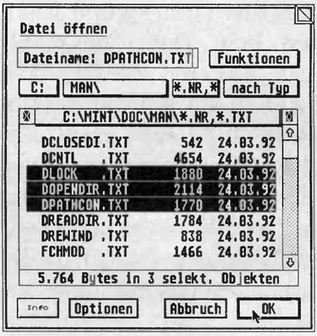 Des weiteren ist Selectric auch der einzige uns bekannte Dateiauswahlbox-Ersatz, der mit den unter »MiNT« verfügbaren symbolischen Laufwerken Q:, U:, V: und X: zurechtkommt. Aufgrund der dynamischen Speicherverwaltung ist Selectric erfreulicherweise in der Lage, Verzeichnisse zu verarbeiten, die mehr als 1500 Dateien enthalten.