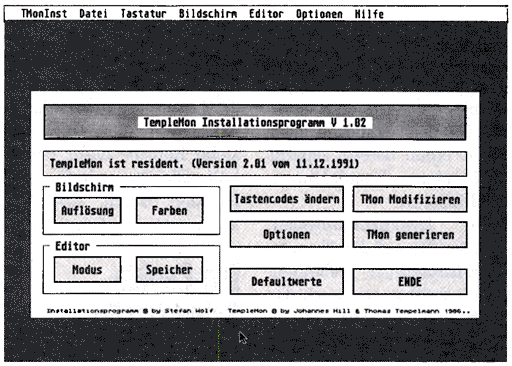 TempleMon 2.0 ist in dem Installationsprogramm »TMonINST« enthalten, das Stefan Wolf beigesteuert hat. Sie können mit diesem Programm verschiedene Parameter im TempleMon setzen und es dann den lauffähigen Monitor generieren lassen. Natürlich ist es ebenso in der Lage, einen bereits separat vorhandenen TempleMon zu modifizieren.