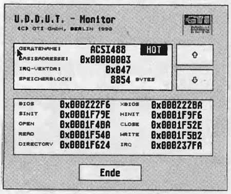 Die Installation übernimmt ein eigenes Programm. Hierzu gehört neben dem ACSI-Treiberprogramm »ACSI488.PRG«« natürlich als wichtigstes Bestandteil die Schnittstelle zum Betriebssystem TOS. Diese wird mit einem eigenen Softwarekonzept von GTI, dem »U.D.D.U.T««-Konzept (universal device driver under TOS) erreicht.