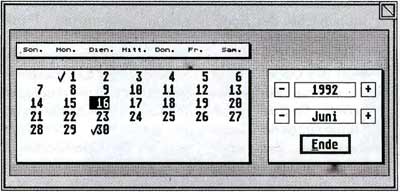 Mit Kalender, einem Public-Domain-Accessory von Jürgen Heindel, wäre das nicht passiert. Die Installation dieses nützlichen Tools ist denkbar einfach: Sie kopieren das Accessory plus Ressource-File auf Ihre Bootpartition. Ab sofort steht Ihnen das Programm nach jedem Booten zu Diensten. Kalender ist in zwei Teile gegliedert — den Notizblock und den Terminkalender. Nach Anwahl seines Menüeintrages entscheiden wir uns zunächst für den Terminkalender. In einer Dialogbox, die man, wie alle anderen Boxen des Accessorys auch, frei auf dem Bildschirm verschieben kann, erscheint eine Übersicht des aktuellen Monats. Per Mausklicks können Sie andere Monate und Jahre anwählen, sei es, weil Sie wissen möchten, ob Ihr Geburtstag im Jahre 2001 auf einen Sonnabend fällt...