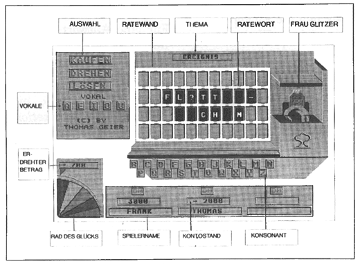 Kennen Sie die Fernsehsendung »Glücksrad«? Für Spannung sorgt dabei hinter der glitzernden Fernsehwand ein kleines Computerprogramm. Für den Spieler gilt es, ein bestimmtes Wort oder einen ganzen Satz aus einem frei wählbaren Themenbereich zu erraten, wobei zuerst nur wenige Buchstaben sichtbar sind. Bei Einsatz eines bestimmten Geldbetrags werden verdeckte Buchstaben enthüllt. Ziel des Spiels ist, das Spielstandkonto der anderen Mitspieler zu übertreffen.