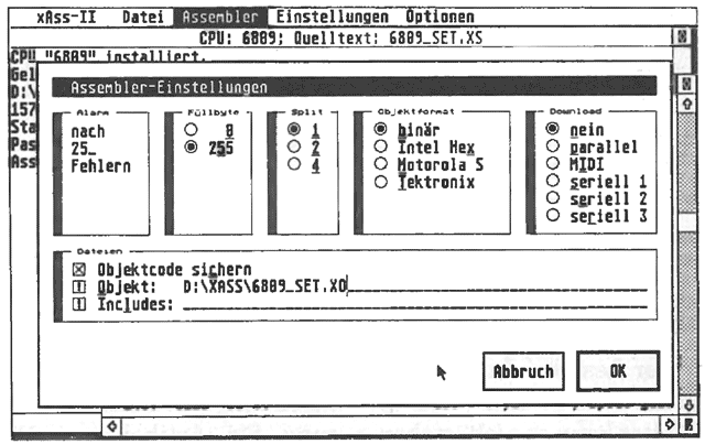 Der Objektcode läßt sich aber nicht nur abspeichern, sondern auch an einer Atari-Standardschnittstelle, z.B. an einen E-PROM-Simulator, ausgeben. In einem separaten Protokoll wird der erzeugte HEX-Code dokumentiert.