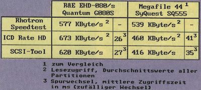 Interessant der Geschwindigkeitsvergleich mit einer Megafile-44-Wechselplatte: Die EHD-080/s ist beim Lesezugriff durchschnittlich 24 Prozent schneller als das Syquest-Laufwerk und beim Spurwechsel rund 30 Prozent (s. Tabelle). Trotzdem beweisen die MeĂwerte, daĂ es nahezu unmöglich ist, zu absoluten Ergebnissen zu gelangen: Alle Benchmarks sind bereits Durchschnittswerte aus je fĂŒnf Einzelmessungen und weichen trotzdem erheblich voneinander ab. Mit diesen Werten gehört die EHD-080/S sicher nicht zu den superschnellen Platten, hĂ€ngt aber vor allem Ă€ltere Konkurrenz (vor allem aus dem 5V2-Zoll-Lager) immer noch locker ab.