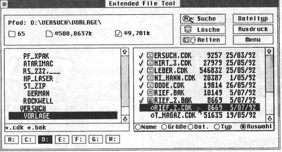Das File-Tool-Modul bietet auch hier Abhilfe. In dem Auswahlmenü klicken Sie einfach die versehentlich gelöschten Dateien an. Unmittelbar danach erscheint ein kleines Gesicht, das über die Rettungschancen Aufschluß gibt: ist es fröhlich, symbolisiert es gute Chancen, das traurige läßt kaum Hoffnung. Bei neutraler Miene ist kein sicheres Urteil abzugeben. Sofern Sie unmittelbar nach Ihrem Mißgeschick diese Funktion bemühen, dürfte immer ein fröhliches Gesicht erscheinen. Pech hat allerdings, wer gleich ein komplettes Unterverzeichnis als Ordner gelöscht hat; dies wird erst gar nicht mehr angezeigt.