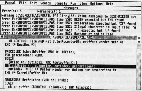 Wie schon in [2] erläutert, überrascht PP mit einigen professionellen Merkmalen, die man beim »Vorbild« vergeblich sucht. Erstens übersetzt der Compiler ein Programm immer vollständig, auch wenn es mehrere Fehler enthält. Besonders bei Programmänderungen gibt es nicht selten ein Dutzend falsch geschriebene Variablen oder dergleichen. Das System öffnet nach dem Übersetzen ein Fenster mit »Messages« des Compilers, das eine Liste aller gefundenen Fehler sowie zusätzliche »Warnings« enthält. Sie bestehen aus einer Angabe von Datei und Textstelle sowie dem Klartext der Fehlermeldung. Man erhält damit einen Überblick über die Fehlersituation und kann die Textpositionen durch Anklicken der Einträge direkt anspringen. Das Fehlerfenster läßt sich jederzeit wieder in den Vordergrund bringen. Dies erlaubt wesentlich zügigeres Arbeiten als in TP, denn trotz der legendären Geschwindigkeit des Compilers, dauert es bei komplexen Projekten doch immer eine gewisse Zeit, bis der nächste Fehler gefunden wird, da TP zumindest die aktuelle Unit immer wieder von vorn zu kompilieren beginnt. Übrigens steht ihm der PP-Com-piler an Geschwindigkeit in nichts nach. Zudem kann man per Help-Taste eine ausführliche Erläuterung der Fehlermeldung mit einem Beispiel, bei dem sie auftritt, und einem Hinweis auf die Beseitigung des Fehlers bekommen.