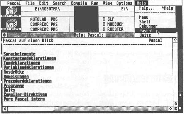 Das Help-Menü besitzt die Einträge Menu, Shell, Debugger, Pascal und Units. Menu zeigt ausführlicher die möglichen Themen Pascal, File, Edit, Search, Compile, Run, View, Options und Help. Dahinter verbirgt sich nichts Geringeres als ein »elektronisches Handbuch« des Systems und der Sprache. Unter Options erhält man etwa die Auswahl der verschiedenen Menüeinträge. Klickt man einen davon an, erscheint ein Textfenster mit einer ausführlichen Erklärung des Menüpunktes.