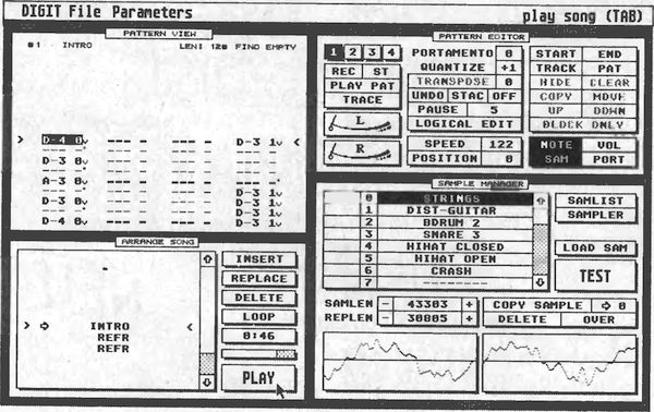 Interessant ist die Arrangementseite. Das MusikstĂŒck besteht aus einzelnen Pattern, die in der Arrangementliste zusammengesetzt werden. Eingespielt werden die Pattern ĂŒber eine Miditastatur. Wer kein Midi-Keyboard besitzt, kann die einzelnen Tasten der Atari-Tastatur umdefinieren und als Einspielinstrument benutzen. Eine ganze Batterie an Werkzeugen hilft beim Schneiden, Editieren und Nachbearbeiten der einzelnen Songteile. Eine Loop-Funktion rationalisiert den Arrangementaufwand.