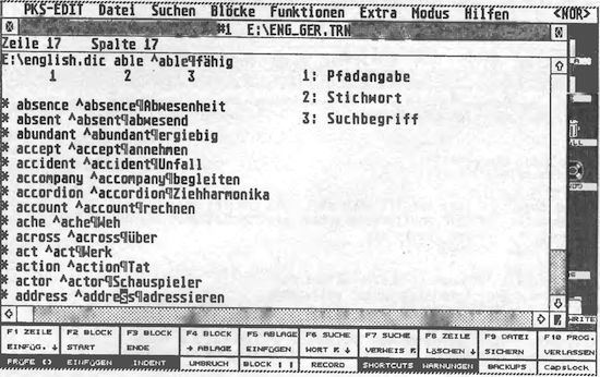 Das Format einer TAG-Datei ist simpel und leicht zu entschlüsseln (s. Abb.). Als ASCII-Datei ist sie mit dem Editor schnell zu bearbeiten. Verweise auf eigene Hilfstexte können auch ohne die mitgelieferten Hilfsprogramme entwickelt werden. Bei unserem Test mit einem Eng-lisch-Wörterbuch war die Erstellung einer TAG-Datei für 5000 Vokabeln mit Hilfe der PKS-eigenen Makrosprache (s.u.) in fünf Minuten abgeschlossen. Die Anzeige des letzten Eintrags des 200-KByte-Wörterbuchs dauerte nach dem ersten Laden nur ein Augenzwinkern.