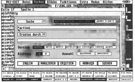 Da Makrosequenzen in der Regel ausgiebig von Suchfunktionen Gebrauch machen, sorgten die Entwickler von PKS-Edit für ein komplexes Suchmenü. Hinter dem ersten Menüpunkt »SUCHEN« verbirgt sich ein Formular, das nur auf einen kleinen Teil der Fähigkeiten des Systems hinweist (s. Abb.). Wie im gesamten Programm, haben die Entwickler auch hier auf eine schnelle und komfortable Handhabung geachtet. Suchbegriffe aus früheren Arbeitssitzungen merkt sich das Programm und stellt sie in einer