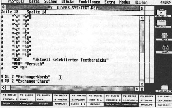 PKS-Edit, mittlerweile in der Version 2.02, gehört ohne Zweifel zu den Paradebeispielen eines modern konzipierten Programms. Es arbeitet mit einem eigenen Desktop. Neben der Möglichkeit, Dokumente als Icons auf dem Arbeitsbereich abzulegen und sie per Mausklick als Fenster zu öffnen, bietet dieses Prinzip weitere Vorteile. Bestimmten Icon-Arten können sog. Werte zugeordnet werden, so daß es möglich ist, ein Icon mit einem externen Programm zu verbinden. Ein Doppelklick auf ein solches Icon veranlaßt den Editor, alle notwendigen Daten zu speichern und das externe Programm zu starten. Nach Programmende kehren Sie automatisch zum Editor zurück. Dadurch ist ein schneller Wechsel zwischen verschiedenen Anwendungen problemlos möglich.