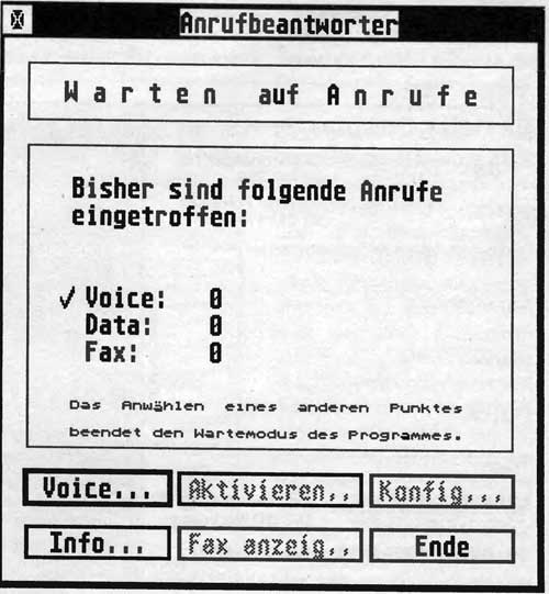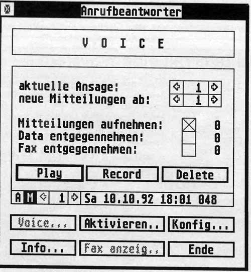 Beim Start des Programms öffnet sich eine Dialogbox im Fenster. Eine gutes Zeichen für den Sachverstand des Programmierers Matthias Stürmer, da dies eine günstige Voraussetzung für den Betrieb unter MultiTOS ist. Es wird die Nummer der aktuellen Ansage, also jene, die beim nächsten Anruf abgespielt wird, sowie die Mitteilungsnummer, ab der aufgenommen werden soll, angezeigt. Sie können diese Werte sowohl per Maus über Richtungspfeile, als auch durch Direkteingabe verändern. Darunter befindet sich die Einstellmöglichkeit, welche Art von Anrufen wie behandelt werden. Etwa, ob nur die Ansage ausgegeben werden soll, oder auch Mitteilungen aufgenommen werden und, ob Fax- und Datenanrufe an die in der Konfigurationsdatei eingetragenen Programme mit festzulegender Kommandozeile weitergeleitet werden sollen. Es existiert sogar schon eine Funktion »Fax anzeigen« in Teil It, die jedoch so lange unberührt bleiben wird, wie die Hersteller von Fax-Programmen auf dem Atari nicht in der Lage sind, ihre Programme extern mit den entsprechenden Parametern steuern zu lassen.