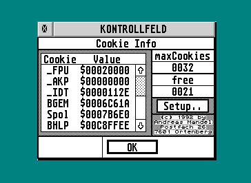»Scookie« zeigt alle installierten Cookies in einer Liste an. Bei einem Mausklick auf einen Eintrag liefert dieses Modul weitergehende Informationen zum jeweiligen Cookie. Zu diesem Zweck muß die »XBRA-Liste« von Julian Reschke vorhanden sein, aus der Scookie die entsprechenden Informationen entnimmt. Außerdem teilt Ihnen Scookie mit, wieviele »Cookie-Plätze« auf Ihrem Rechner noch frei sind.