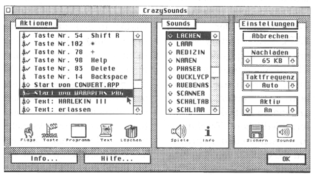 Crazy Sounds ist kein Musikprogramm für MIDI-Fans, sondern gewissermaßen eine akustische Betriebssystemerweiterung: jede Dialogbox, jede Alertbox und jeder Fenstertext kann vertont werden. Gleich nach dem Einschalten begrüßt Sie der Rechner mit einem freundlichen »Du schaust aber gut aus heute«. Beim Anlegen eines neuen Ordners fragt er interessiert »Wie heißt er denn?« Starten Sie das beigefügte Konvertierungsprogramm, kommentiert Crazy Sounds dies schelmisch mit »zu Risiken und Nebenwirkungen fragen Sie Ihren Arzt oder Apotheker« und bei 1st Word bricht er in schallendes Gelächter aus. Sogar Wörter, die Sie gerade in einer Textverarbeitung tippen, lassen sich mit Geräuschen oder Kommentaren verknüpfen. Es geht aber auch bescheidener: allein der einfache Druck auf die »Shift«- oder die »Control«-Taste ruft die skurrilsten Soundeffekte hervor. Und berührt der Mauszeiger den Bildschirmrand, macht es »Boing«. Wird einer Aktion ein ganzer Sound-Ordner zugewiesen, wählt Crazy Sounds per Zufall eines der Samples aus. So bleibt Ihnen die Qual der Wahl erspart und Sie bekommen teilweise überraschende Kommentare. Selbst Systemabstürze entlocken den Lautsprecher noch eine bissige Bemerkung.