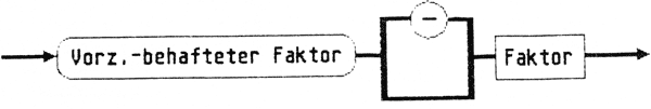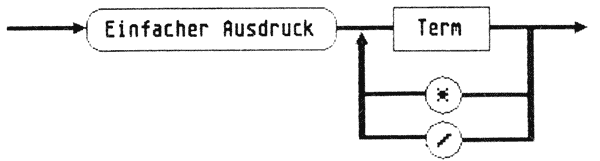 In Bild 2 ist nun allgemein ein arithmetischer Ausdruck dargestellt, der aus beliebig vielen einfachen Ausdrücken besteht, die über das Plus- oder Minuszeichen verknüpft sein können. Dies ist durch die Abzweigung hinter dem Käsen „Einfacher Ausdruck“ verdeutlicht, was bedeutet, daß hier abgebogen wird solange einem Teilausdruck ein Plus- oder Minusoperator folgt.