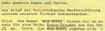Die Besitzer alter EPSON-Drucker der Serien RX, FX, MX und JX haben Anlaß zur Freude. Die Firma Weide Elektronik bietet ein NLQ-Modul an, das auch bei diesen älteren Druckern ein Schriftbild in Near-Letter-Qualität erzeugt. Es muß lediglich ein EPROM im Drucker ausgetauscht werden, jeder kann diese Umrüstung leicht vornehmen. Verschiedene Schriftarten lassen sich durch eine bestimmte Tastenfolge der eingebauten Druckertasten anwählen. Das NLQ-Modul kostet DM 149, - .