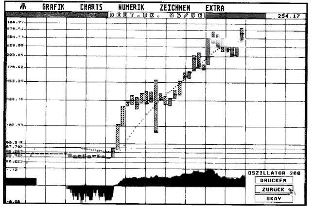 Doch was bietet JAMES 3.0? Kernpunkte sind die Chartanalyse und umfang reiche Listenauswertungen. Von normalen Liniencharts, über Logarithmencharts und Balkencharts bis hin zum Point & Figure-Chart wird das professionelle Instrumentarium moderner Chartanalyse geboten. Bis zu 1.250 Kurse pro Aktie können gespeichert und dargestellt wer den, womit sogar eine Langfristbeobachtung möglich ist. Bis zu vier Charts lassen sich simultan am Bildschirm dar stellen, wobei ein Wechsel der einzelnen Charts ebenso möglich ist, wie das Darstellen von verschiedensten Indikatoren zu einem Wertpapier. Desweiteren lassen sich Oszillatoren, OVB/OVS-Charts, RSI- und Momentumskurven einblenden. Neben den Charts werden alle wichtigen fundamentalen Daten des Wertpapieres eingeblendet. Auch Charts anderer Titel kann man problemlos einblenden. Insbesondere