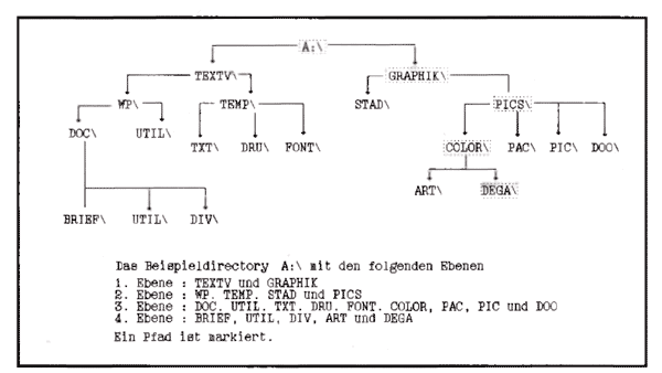 Betrachtet wird dabei das Beispiel eines Directorys, wie es sich in der Abbildung 1 darstellt. Ausgehend vom Wurzelverzeichnis, kann man die beiden Verzeichnisse TEXTV und GRAPHIK sehen, von denen aus sich weitere Verschachtelungen ergeben. Zur Vereinfachung wird diese Verschachtelung hier nicht allzu weit getrieben, um noch die Ăbersichtlichkeit zu erhalten. Zur Bearbeitung der Struktur werden einige der GEMDOS-Funktionen verwendet, die im folgenden kurz beschrieben werden.