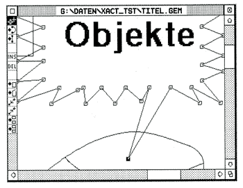 In diesem Modus läßt sich die Spitze der Sprechblase verschieben, während der Rest an seiner alten Position bleibt. Gleichfalls lassen Sich dann innerhalb der Linienzüge Linien zu Kurven und umgekehrt wandeln. Linienzüge können geschlossen und geöffnet werden, und sogar die ,unsichtbare' Verbindung zwischen zwei Teilen eines Zuges ist vorgesehen. An dieserStelle darf man allerdings nicht die Funktionalität eines Didot Line Art oder ähnlicher Programme erwarten. Das gleichzeitige Selektieren mehrerer Stützpunkte z.B. beherrscht Xact Draw bereits nicht mehr. Das Schwergewicht liegt vielmehr auf einfacher Bedienung.