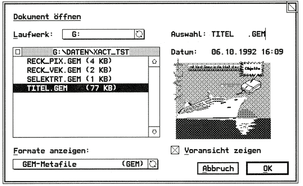 Oder die Xact-Draw-eigene Dateiauswahlbox, die ein einmaliges Feature birgt: eine Vorschaumöglichkeit auf GEM-Dateien. Dafür braucht es zwar - je nach Plattengeschwindigkeit und Größe der Datei - etwas Zeit, aber das ist allemal besser, als sie tatsächlich zu laden. Zumal einem so einige Mausklicks erspart bleiben.