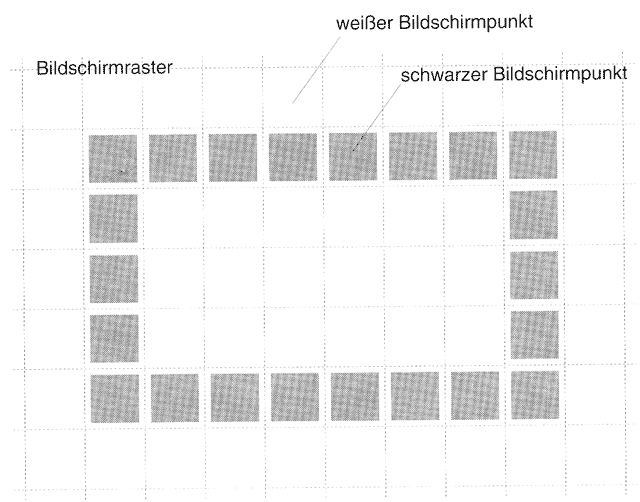 Zunächst betrachten wir, wie ein herkömmliches Malprogramm ein Rechteck darstellt. Es färbt auf dem Bildschirm einzelne Punkte schwarz, der Hintergrund bleibt weiß. Als Datenbasis fungiert das Bildschirmraster. Ein nachträgliches Verändern dieses Rechtecks ist nicht möglich. Was passiert nun, wenn solch ein Bild auf einen Drucker ausgegeben wird? Der Drucker besitzt z.B. ein Punktraster, das viermal so dicht ist. Dann wird das Rechteck eben nur ein Viertel so groß. Vorteil der Pixel-Technik: Sie läuft schnell ab und ist programmseitig leicht zu handhaben, da sich die Bilder als simple Speicherbereiche darstellen.