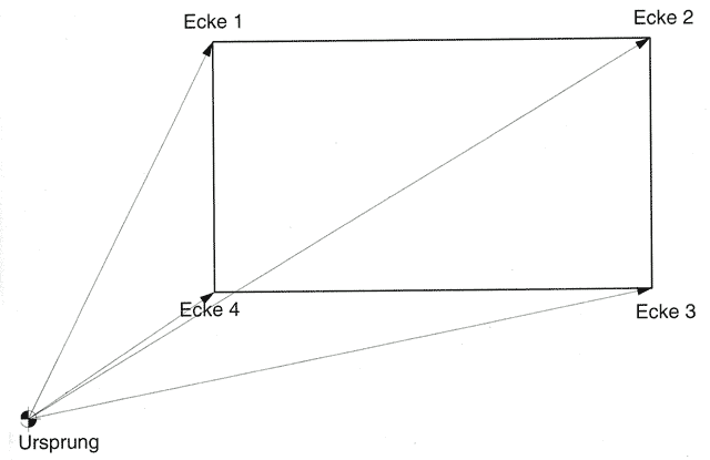 Ganz anders im Vektor-Format. Unser Rechteck basiert auf seinen vier Eckpunkten. Die Denkweise ist etwas mathematischer. Es gibt einen Ursprung, von dort an zählen Koordinaten in waagerechter und senkrechter Richtung. Jeder Punkt im Bild wird durch ein Koordinatenpaar (einen ,Pfeil1 oder , Vektor1) eindeutig beschrieben. Das Grafikprogramm legt für ein Bild eine Liste an, in die es alle Objekte des Bildes einträgt. Solch ein Eintrag könnte so lauten:
