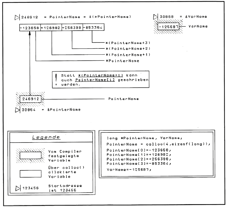 Damit wird dem Compiler mitgeteilt, daß er eine Pointer-Variable PointerName einrichten soll, die später die Startadresse des Datenfeldes vom Typ long mit dem Namen *PointerName enthalten soll.