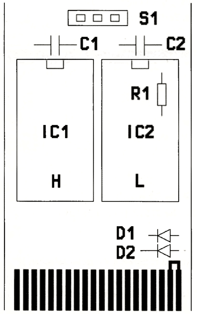 Das Platinen-Layout dazu ist aus Platzgründen ebenfalls nur als PCB-Datei in unserer Redaktionsmailbox abrufbar. Den Bestückungsplan sehen Sie in Abb. 6, die benötigten Bauteile in der Stückliste. Alle Lötpunkte sollten durchkontaktiert werden! Haben Sie das dafür nötige Werkzeug nicht, reicht es auch, die nicht mit Bauteilen belegten Lötpunkte auf der Bestückungs- und Lötseite mit Drahtstückchen zu verbinden sowie die Bauteile auch auf der Bestückungsseite zu verlöten, was aber nur da nötig ist, wo eine Leiterbahn auf der Bestückungsseite zum jeweiligen Pin führt. Die IC-Fassungen sollten dann sog. "flache IC-Fassungen" sein, bei denen die Kelche besonders weit aus dem Kunststoffträger unten herausragen. Da die beiden IC-Fassungen dicht beieinander liegen, ist es ratsam, zuerst die Fassung von IC2 zu bestücken. Übrigens wird das Verlöten der Kelche auf der Bestückungsseite durch Verwendung von SMD-Lot (0.5mm) immens erleichtert.