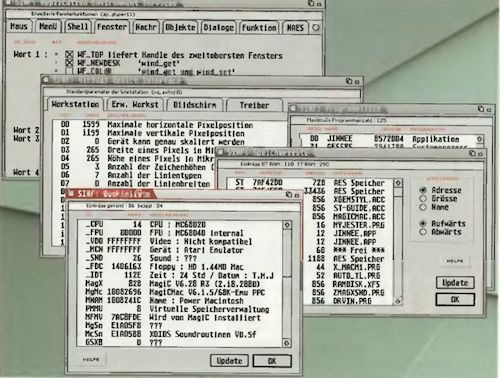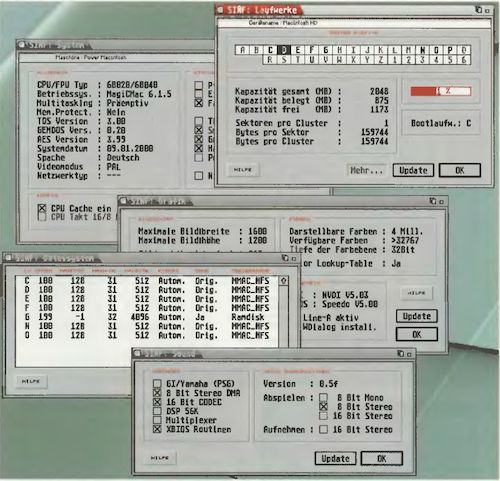 Software. Weiter geht es im Bereich der installierten Software. Zunächst einmal können weitreichende Informationen zum vorhandenen AES-System ausgegeben werden. Diese sind nicht nur für Anwender, sondern in erster Linie auch für Entwickler interessant, denn bis ins Detail werden Möglichkeiten und Einstellungen des installierten AES beleuchtet. Lob verdient dabei die übersichtliche GEM-Oberfläche, die dem Benutzer die einzelnen Informationen mittels Karteikartenreiter bereit stellt - komfortabler geht es nicht mehr. Die Daten sind dabei so reichhaltig, dass zwischen zwei Reihen hin- und hergeschaltet werden kann.