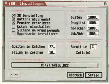 Nun aber los. Nach dem Programmstart trägt SysInfo seine Menüleiste ein, aus der die verschiedenen Analysekriterien abrufbar sind. Die aufrufbaren Informationen sind fein säuberlich in die Bereiche Datei, Hardware und Software eingeteilt. Das Programm erfreut durch vollständige Einbindung in die GEM-Oberfläche und macht daher auch unter Multitasking-Betriebssystemen eine gute Figur. Das nach dem ersten Start etwas altertümlich anmutende zweidimensionale Äußere ist in den Voreinstellungen gegen einen aktuellen 3D-Look austauschbar - so hat auch das Auge seine Ruhe.