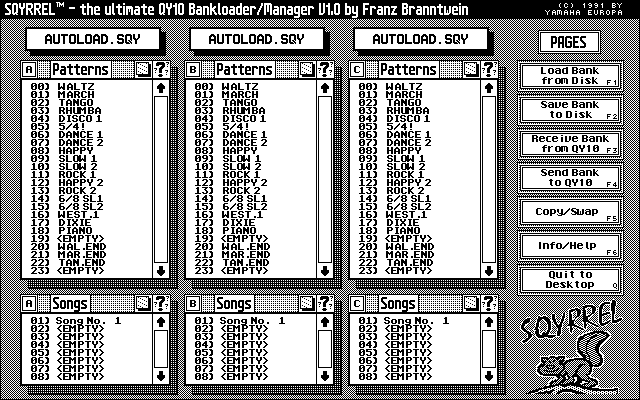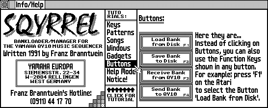 Sqyrrel arbeitet sowohl auf einem ST — bereits ab 520 KByte RAM — als auch auf STEs oder TTs. Die Programmdiskette enthält weitere fünf komplette Bulk-dumps; darunter versteht Yamaha jeweils einen vollständigen Satz mit Pattern und Songs.