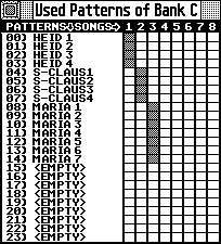 Die wichtigste Aufgabe ist das Senden und Empfangen, sowie das Sortieren von vorprogrammierten Pattern und kompletten Songs. Pattern werden bankweise übertragen, jeweils 24 Stück pro Transfer. Dabei spielt es keine Rolle, ob Sie die Daten auf eine Atari-Diskette oder direkt an das Pocket-Studio schicken. Sqyrrel verfügt über die wichtigsten Copy- und Austauschfunktionen. Damit lassen sich bequem — je nach Song — die nötigen Pattern zusammenstellen. Unter »Used Pattern« gibt Sqyrrel sogar Auskunft, welche Pattern die acht möglichen Songs verwenden.