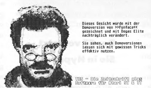 Wer sich schon einmal an Gesichtern versucht hat, weiß wie schwer es ist, die menschlichen Züge perfekt nachzuzeichnen. Abhilfe schafft hier das Programm »That's Funface« aus dem Hause Compo. Wem die Originalversion zu teuer ist, der findet auf der Diskette G71 eine eingeschränkt funktionsfähige Public-Domain-Demoversion. Trotz einer geringen Anzahl von Gesichtsteilen macht das Zusammenstellen eigener Gesichter viel Spaß. Da die Demoversion keine Funktion zum Speichern besitzt, müssen Sie den gesamten Bildschirm speichern, beispielsweise mit dem Programm »SCRDUMP« aus dem STAD-Lieferumfang, das über die Tastenkombination <Alternate-Help> den Bildschirminhalt im 32 KByte-Format auf Diskette speichert. Solche Programme finden Sie aber auch im PD-Bereich. Anschließend laden Sie das Bild mit Ihrem Zeichenprogramm, löschen die überflüssigen Rahmen, vergrößern oder verkleinern nach Bedarf das Gesicht und speichern es als Block bzw. als Objekt. Dieses binden Sie dann in Ihre fertigen Grafiken ein.