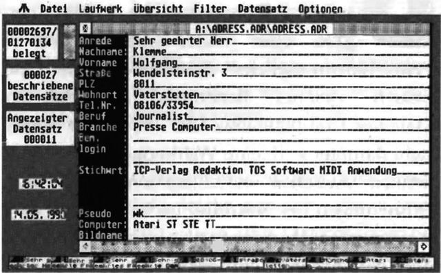 Die Dateiverwaltung »Maxidat« ist leicht zu bedienen, vollstĂ€ndig in GEM eingebunden und lĂ€uft in Farbe oder SchwarzweiĂ. Sie verwaltet laut Handbuch bis zu 100000 DatensĂ€tze in einem Mega ST4 und speichert dazu die Daten lediglich mit der tatsĂ€chlichen FeldlĂ€nge. Jeder Datensatz besteht aus einer Maske von 19 Eingabefeldern mit jeweils 54 Zeichen LĂ€nge. Diese Vorgabe schrĂ€nkt die Verwendung von Maxidat fĂŒr bestimmte Anwendungen ein. Es gibt dennoch einen Weg, lĂ€ngere Textpassagen in einen Datensatz zu integrieren. Das Programm erlaubt den Zugriff auf eine externe ASCII-Datei, die es bei Bedarf anzeigt. Dazu trĂ€gt der Anwender in einem Feld den Pfad zu dieser Datei ein. Der Befehl »Text zeigen« holt den Text auf den Bildschirm. LĂ€ngere Zitatstellen und Textpassagen lassen sich so leicht in einen Datensatz integrieren. Die Suchfunktionen greifen aber nicht auf die externen Dateien zu. Genauso funktioniert die Einbindung von Bildern im STAD-, Degas-, Neochrome- und Screen-Format. Maxidat unterstĂŒtzt alle Bildschirmauflösungen und konvertiert die Bilder bei Bedarf. Besonders die Einbindung von Grafiken erlaubt reizvolle Anwendungen. Legen Sie z. B. eine Bilddatenbank an, in der Sie jeweils einige Hauptbegriffe, Datum der Zeichnung, Verwendungszweck und den Pfad fĂŒr das Bild bestimmen. Haben Sie die Sammlung auf numerierten Disketten oder auf der Festplatte, dann sehen Sie mit »Bild zeigen« sehr schnell die entsprechende Grafik. So lĂ€Ăt sich, zumindest teilweise, eine assoziative Datenbank nachbilden. Eine witzige Anwendung der Bildeinbindung findet sich in der Info-Box. Der Punkt »Danksagung« zeigt die Bilder der wichtigsten Maxidat-Helfer bei Klick auf den jeweiligen Namen. Die DatensĂ€tze und auch die Bezeichnungen der Felder lassen sich jederzeit Ă€ndern, ergĂ€nzen oder löschen, ohne daĂ eine Neuformatierung der Datei nötig ist. Ăhnlich flexibel arbeitet das Programm in fast allen Funktionen. So wĂ€hlen Sie die Suchfunktion fĂŒr eines oder alle Datenfelder und suchen nach der angegebene Zeichen kette. Dabei ist die Position innerhalb des Feldes unwichtig. Suche: Name=Klemme findet sowohl den Eintrag »Klemme, Wolfgang« als auch »Wolfgang Klemme«. ZusĂ€tzlich gibt es Joker, z. B. fĂŒr die berĂŒhmte »M??er«-Suche.