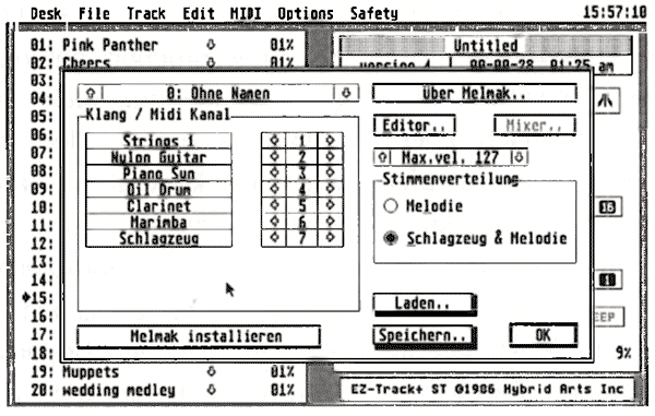 Das Programm ersetzt nicht die alte Melody-Maker-Software. Nach der Installation übernimmt Melmak die Kommunikation zu einem Sequenzerprogramm wie z. B. »EZ Track+«. Rufen Sie nach dem Start des Sequenzerprogramms Melmak auf, stehen Ihnen die neun Instrumente bzw. sechs Instrumente plus Schlagzeug aus dem Melody Maker zur Verfügung. Sie bestimmen für jedes Instrument den Ml-Dl-Kanal und die Lautstärke der einzelnen Instrumente. Steuern Sie z. B. einen Streichersatz über Melmak, integrieren Sie alle Instrumente mit der gleichen Lautstärke in das Gesamtsystem. Sind alle Einstellungen vorgenommen, läßt sich ein solches »Setup« speichern und bei Bedarf nachladen. Insgesamt 30 Setups stehen gleichzeitig zur Verfügung.