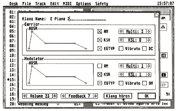 Neu an Melmak ist der Editor für eine Vielzahl von Klängen. Abgesehen von den Preset-Sounds verändert er Klänge in weiten Bereichen. Die zwei Operatoren der FM-Synthese stellen allerhand Klangzauber an. Melmak ist ein unverzichtbarer Zusatz für alle, die den Melody Maker jetzt auch mit erweiterter Sequenzersoftware nutzen wollen. Hybrid Arts bietet den Melody Maker mit Melmak und dem Sequenzer EZ-Track+ für 349 Mark an. Besitzer des Melody Makers bekommen für 50 Mark den Melmak und EZ-Track+, Besitzer des Sequenzers erhalten Melody Maker plus Melmak für 249 Mark. Haben Anwender bereits beide Produkte, gibt es Melmak gegen Einsendung einer formatierten Diskette und adressierten Rückumschlag mit 3 Mark Porto.