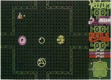 Beim futuristischen Action-Ballspiel »Projectyle« wird in trauter Dreisamkeit um Punkte und Tore gekämpft. Jede Partie findet auf einem Spielfeld statt, das in fünf Zonen unterteilt ist. In drei Zonen hat je eine Mannschaft ein Tor stehen; dazu kommen ein Raum, in dem ein Tor pro Team steht und eine torlose Zwischenzone, die nur zur Ball Verteilung dient. Jede der drei Mannschaften steuert eine eigene Spielfigur, die durch schnelle Drehungen und Rammanöver versucht, den Ball in eines der gegnerischen Tore zu schießen. Per Zufall tauchen manchmal Extras auf dem Spielfeld auf, deren Aufsammeln sowohl positive als auch negative Folgen nach sich zieht. Die intergalaktische Projectyle-Meisterschaft findet in einer Liga statt, deren Tabelle nach jedem Match erscheint. Zwischendurch dürfen Sie den Spielstand auf Diskette speichern. Der Computer übernimmt beliebig viele der insgesamt acht Mannschaften und bietet drei Schwierigkeitsgrade an. Es können aber auch zwei oder gar drei Spieler aus Fleisch und Blut gleichzeitig antreten, was das Stimmungsbarometer in nie geahnte Höhen schießen läßt.