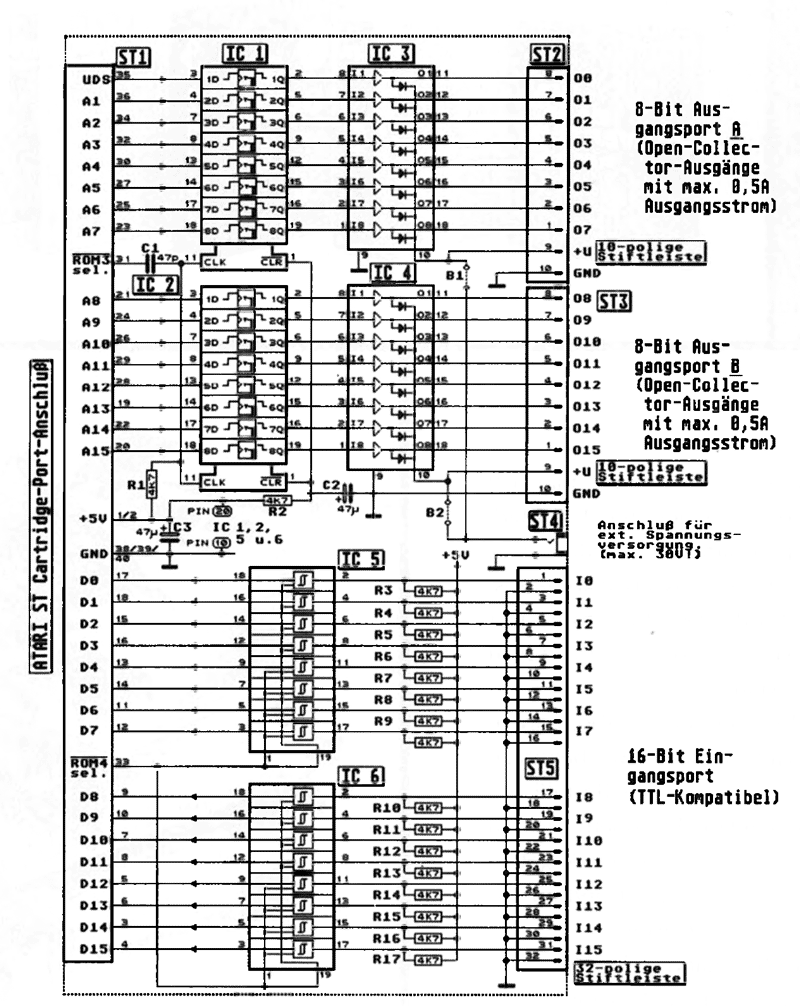 Hardware-Interessierte mit Hang zum »Was könnte man nicht alles mit einem Computer steuern, wenn man nur Ein- und Ausgangsleitungen zur Verfügung hätte« springen beim ST nicht gerade vor Freude in die Luft. Doch Hilfe naht: Über den ST-Cartridge-Port (eigentlich für Software auf EPROMs vorgesehen) läßt sich mit einigen zusätzlichen ICs ein preiswerter, einfacher und doch leistungsfähiger Ein-/ Ausgangsport verwirklichen.