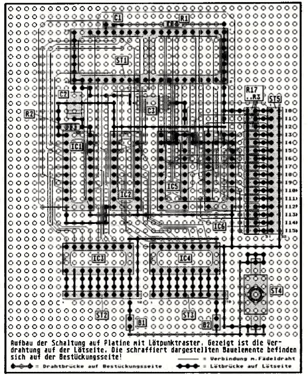 Damit die Sache nicht zu kompliziert wird, zeigt Bild 2 die Anordnung der Bauelemente auf der Platine und deren Verbindung untereinander. Bei der Darstellung ist zu beachten, daß die Verdrahtungsseite der Platine zu sehen ist, damit Sie die Verbindungsleitungen besser erkennen. Die schraffiert dargestellten Bauteile befinden sich also auf der bei der Verdrahtung nicht sichtbaren Bestückungsseite der Platine.