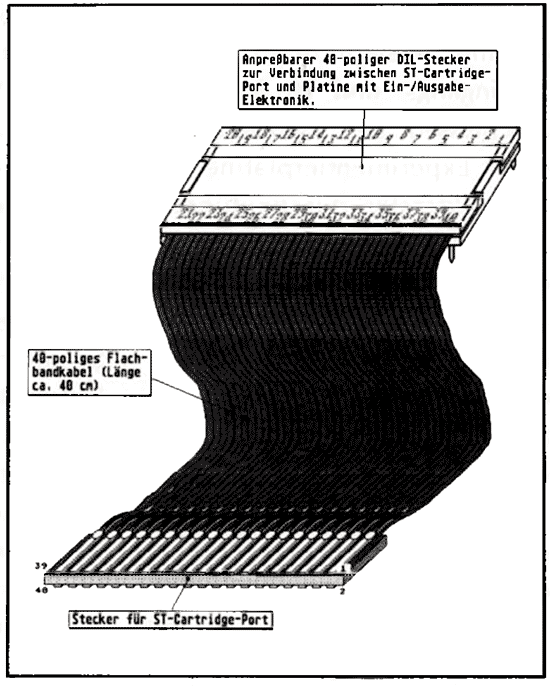Nachdem nun die I/O-Port-Schaltung auf der Platine aufgebaut ist, fehlt nur noch die Verbindung zwischen der Platine (über den 40poligen IC-Sockel ST 1) und dem Cartridge-Port des ST. Dazu quetschen Sie an der einen Seite des 40poligen Flachbandkabels den ebenfalls 40poligen DIL-Stecker. Der paßt dann in den 40poligen IC-Sockel ST1 auf der Platine. An das andere Ende des Flachbandkabels kommt der Cartridge-Port-Stecker. Es sind inzwischen Direkt-Steckverbinder für den ST-Cartridge-Port auf dem Zubehörmarkt erhältlich. Der Autor hat hierfür jedoch einfach eine alte Cartridge-EPROM-Platine verwendet und davon nur den Platinenteil mit der Direktsteckverbindung an das Flachbandkabel angelötet.
