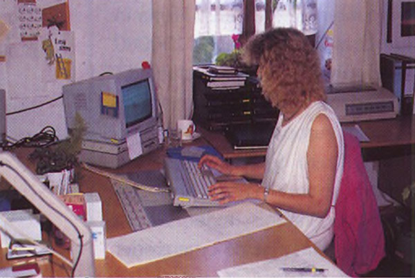 Sekretärinnen geben die Texte der Dokumentationen in das Programm »That's Write« ein, Grafiken entstehen mit »Arabesque«.