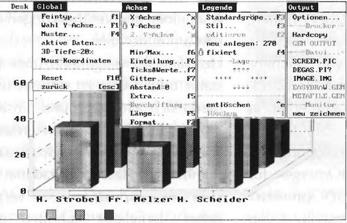 Sollten Sie mit einem HP-Taschenrechner groß geworden oder FORTH-Freak sein, dann ist Ihnen die »Umgekehrte polnische Notation« (UPN) in Fleisch und Blut übergegangen. BASiCHART unterstützt diese Form. Benötigen Sie eine ausgefallene Einheit hinter den Zahlen (vielleicht Bq), legen sie diese selbst fest. Die Druckerausgabe ist, wie unter »1st Word Plus«, sehr einfach über eine Druckdatei geregelt.Mit dem Grafikteil stellt sich BASiCHART neben Beckercalc und LDW 2.0. Es setzt neue Akzente, beispielsweise durch freie Wahl der Tiefe für die 3. Dimension. Ein eigenes Grafikmenü erlaubt eine Vielzahl von Eingriffen in die Grafik.